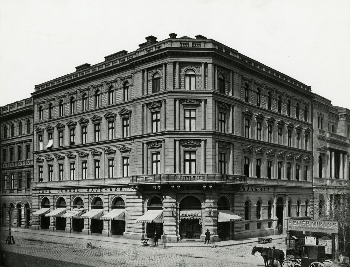 Az egykori Ország út (ma Múzeum körút) és Sándor (ma Bródy Sándor) utca sarkán álló Schodl-kávéház báró Fechtig Károly bérházának földszintjén. Klösz György felvétele 1878 körül (Fotó: FSZEK Budapest Gyűjtemény)