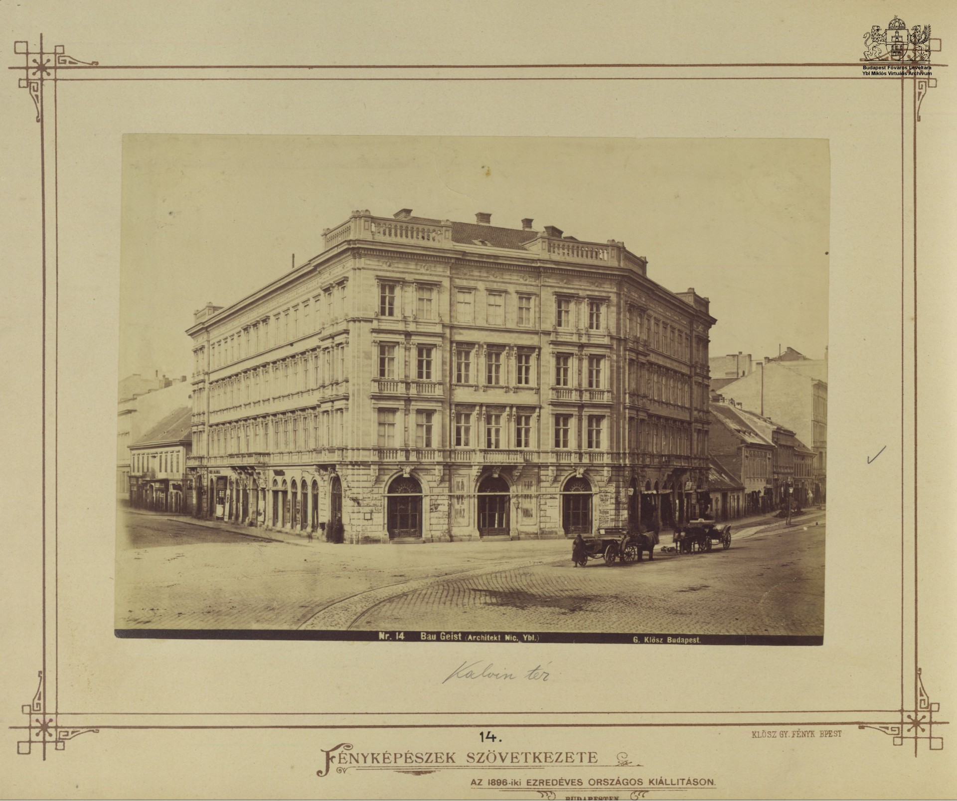 A mára már elpusztult, Ybl tervezte Geist Gáspár bérháza a Kálvin téren. Földszinti részén működött a Báthory kávéház (Fotó: Ybl Miklós Virtuális Archívum, HU BFL - XV.17.f.331.b - 066)