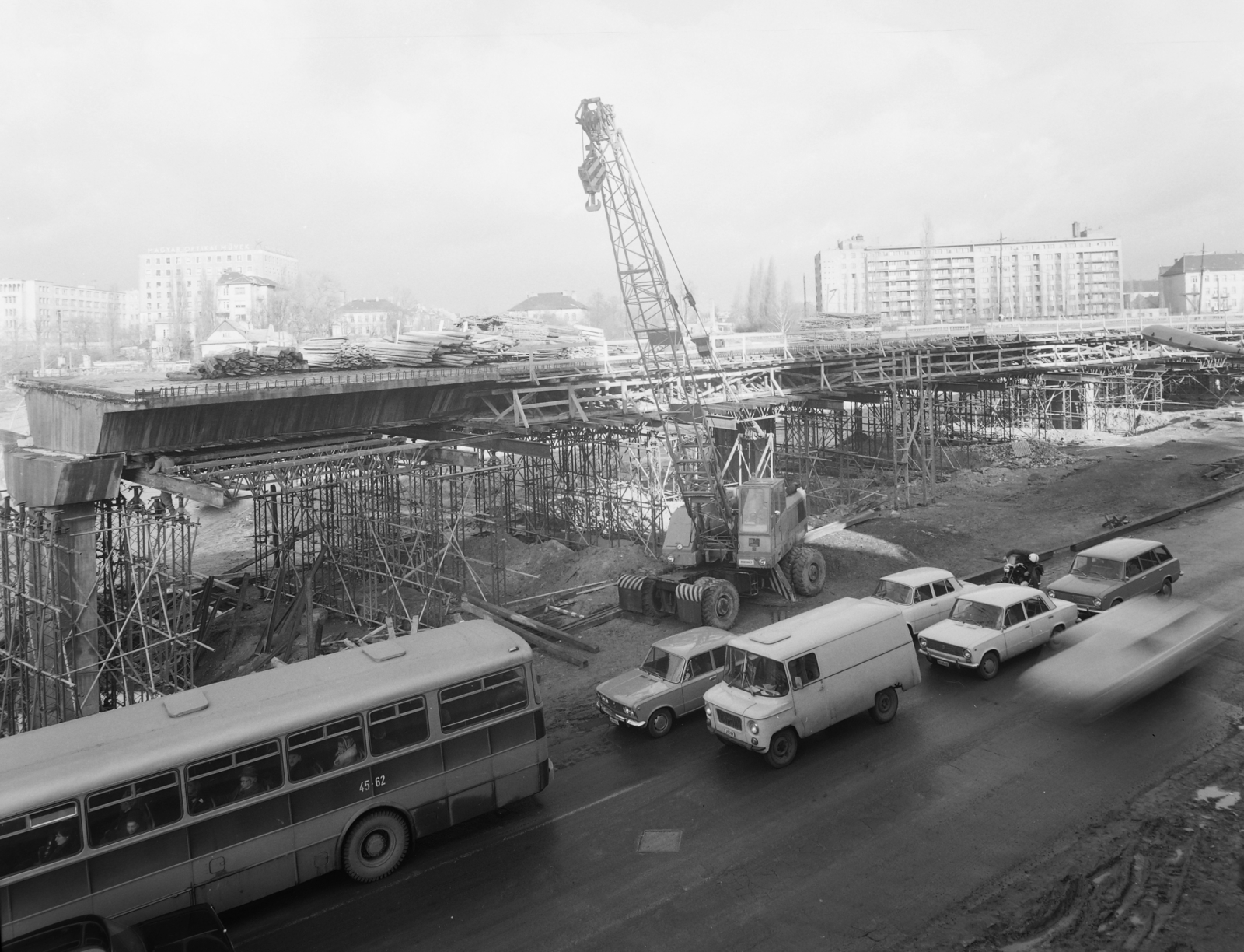 A csomópont rendezésére 1971-ben írtak ki pályázatot, de a beruházás csak 1974-ben indult meg, első körben épületbontásokkal, hiszen a közlekedésnek kellett a hely. Ezért elbontottak összesen 73 lakást, három üzletet, egy óvodát, műhelyeket, raktárakat, valamint a régi vámházat, amelyben katolikus templom és plébánia működött, de a Testnevelési Egyetem sportpályáitól is el kellett vonni területet. A felüljáró építése 1975 második negyedévében indult meg, és másfél év alatt készült el. Az eredeti határidő 1977 májusa volt, vagyis ez a híd a határidő előtt négy hónappal elkészült úgy, hogy az utolsó hetekben az időjárás nem volt kedvező az építkezéshez. Ahogy a Magyar Nemzet az átadásról írta 1976. december 23-án: