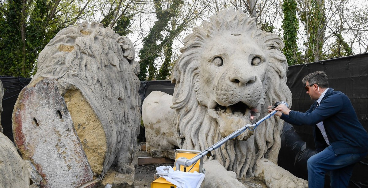 A budai oroszlánok restaurálásánál a makacs szennyeződések eltávolításához orvosi lézert is bevetnek (Fotó: MTI/Kovács Tamás)