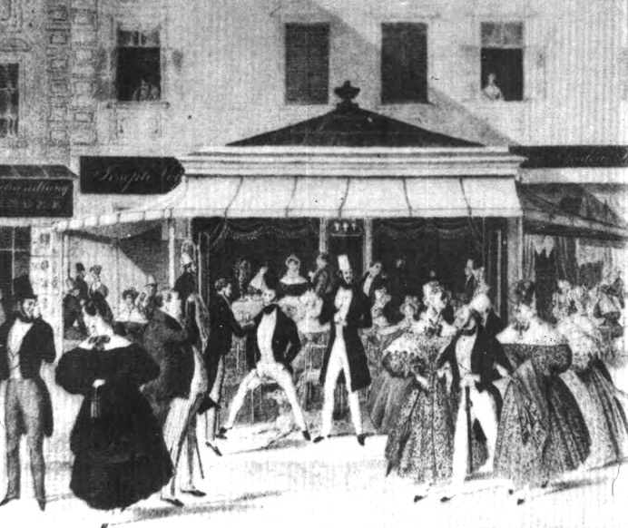 Fagylaltozókioszk a bécsi Grabenen 1836-ban, Alexander v. Bensa színes litográfiájának reprodukcióján