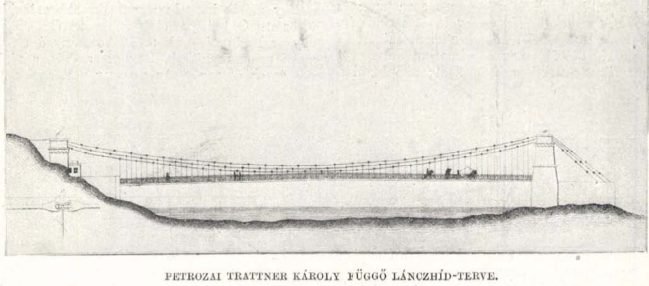 Egy korai lánchídterv, Trattner Károly elképzelése 1828-ból (Forrás: Vasárnapi Ujság, 1914. március 15.)