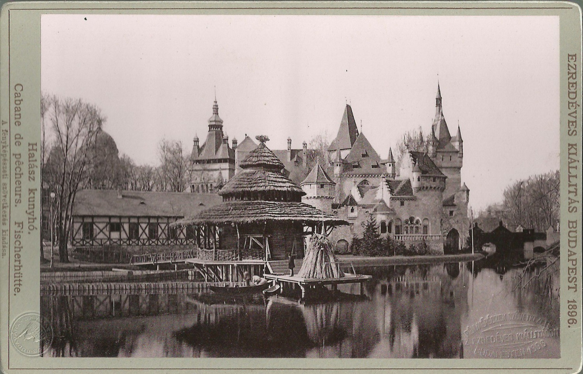 Városliget: Halászkunyhó és háttérben a történelmi főcsoport épületei a Vajdahunyad várával. Klösz György felvétele (Forrás: Magyar Nemzeti Digitális Archívum/Magyar Kereskedelmi és Vendéglátóipari Múzeum)