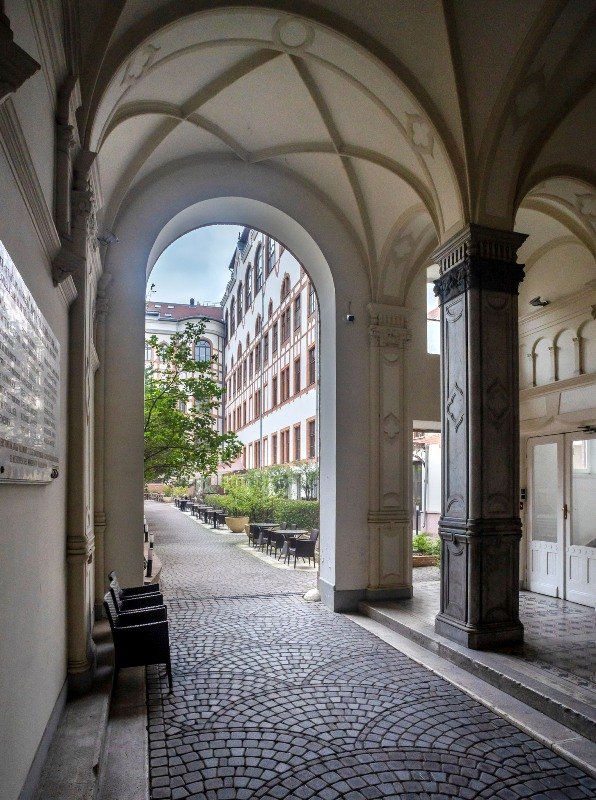 A helyreállítás nem csak a külső és belső homlokzatra szorítkozott: a jobb oldali kaput ellensúlyozandó a pincében elhelyezett mélygarázs megközelítéséhez a bal oldalon alakítottak ki az épület stílusához alkalmazkodó lehajtót, az udvaron keresztül pedig átjárót létesítettek a Nagymező utca és a Hajós utca között – aki itt átkel, a jelen kulisszái között pár perc erejéig visszautazik abba a százhúsz évvel ezelőtti korba, amikor ezt a funkcionális telefonközpontot még az udvaron is tégladíszekkel látták el, illetve a nem is olyan távoli múltba, amikor hozzáértő kezek állították helyre az arra méltó épületet.