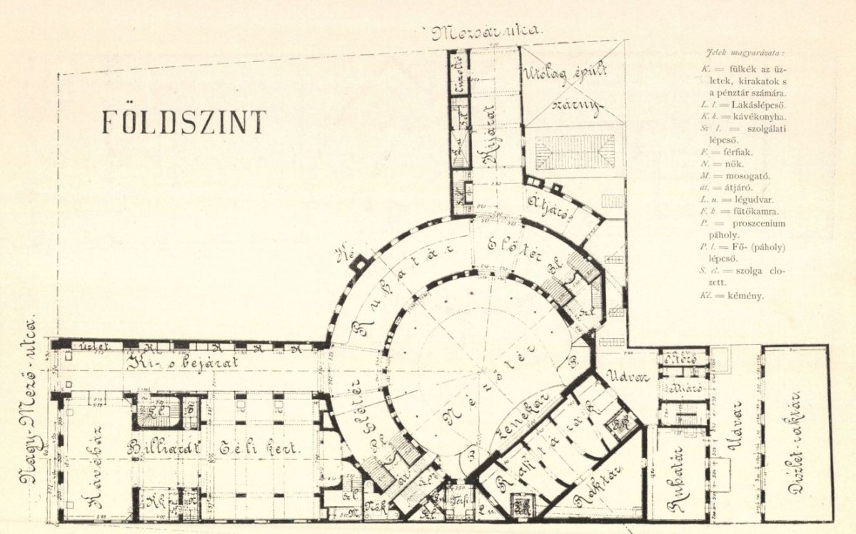 Az osztrák tervezők – Schomann Antallal kiegészülve – a problémás telekviszonyok miatt szokatlan alaprajzot voltak kénytelenek szerkeszteni. A Nagymező és a Mozsár utca sarkán álló ingatlant ugyanis Somossynak nem sikerült megszereznie, így az utcafrontokra csak egy-egy keskeny szárny nyúlhatott ki. Ezek egymásra merőlegesek, a találkozásuknál álló központi tömb pedig negyvenöt fokos szöget zár be azokkal. Utóbbi legnagyobb részét a félköríves nézőtér foglalta el, a színpad pedig az Andrássy út felőli végét töltötte ki. A Nagymező utcai részben a bejárati folyosó mentén egy kávéház és egy télikert, az emeleten pedig lakások kaptak helyet, a Mozsár utcára kivezető keskeny folyosó mellett pedig a konyha üzemelt, de fölötte voltak lakások, sőt az igazgatóság irodái is ide kerültek. A színpad mögött egy rövid harmadik szárnyban pedig raktárak sorakoztak.