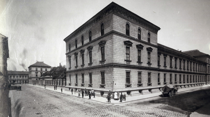 Az építkezés 1855-ben kezdődött, és a főépület Hild József műépítész tervei alapján, Wagner János építőmester irányításával 1856 októberében el is készült. A kétemeletes, klasszicista architektúrájú épület zárókövét az alapítás után 10 évvel, 1866. február 27-én helyezték el a főépület csarnokában Ferenc József és Erzsébet királyné jelenlétében – a kő ma is látható a Rózsák tere felé néző épületrészben. A 300 fő befogadására alkalmas szegényházat dr. Rózsay József orvos több mint három évtizeden át irányította. Az ő jegyzeteiből és leírásaiból sokat megtudhatunk az aggok menhelyének történetéről. Rózsay egyébként tudományos szempontból is hasznosította tapasztaltait. Egyik publikációjának például ez a címe: „A pesti agg-ápolda és az aggkorban gyakrabban előforduló sajátságos lefolyású kórok.” Másik nevezetes tanulmánya: „Észleletek az aggkor élettani és kórtani változásai köréből, s a pestvárosi agg-gyámoldának 34 évéről 1830-tól 1863-ig.”