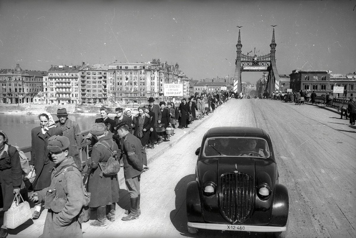 A Szabadság híd ideiglenes szerkezetén nem járt villamos (Fotó: Fortepan/Vörös Hadsereg)