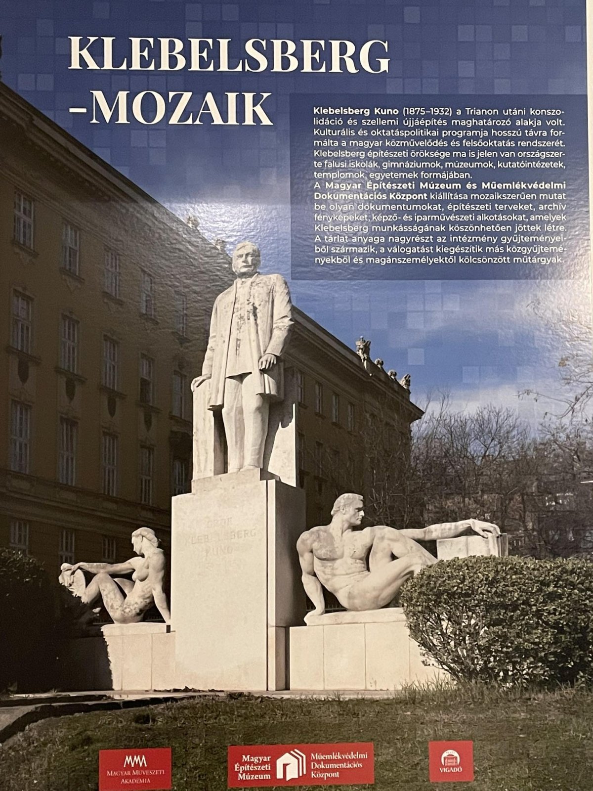 Tavaly ünnepltük Klebelsberg születésének 150. évfordulóját, akkor, 2025 őszén a Magyar Építészeti Múzeum és Műemlékvédelmi Dokumentációs Központ (MÉM MDK) kerítéskiállítást rendezett a kultúrpolitikus emlékére a Magyar Művészeti Akadémia Andrássy úti székházánál (amely szervezet alá tartozik). Ezt követően született meg egy következő kiállítás ötlete, Klebelsberg-mozaik címmel, amely a napokban nyílt meg a Pesti Vigadóban, s amelyen a kiállított, egymás mellé helyezett töredékekből rajzolódik ki az egykori miniszter kulturális államépítő tevékenységének összetett képe.