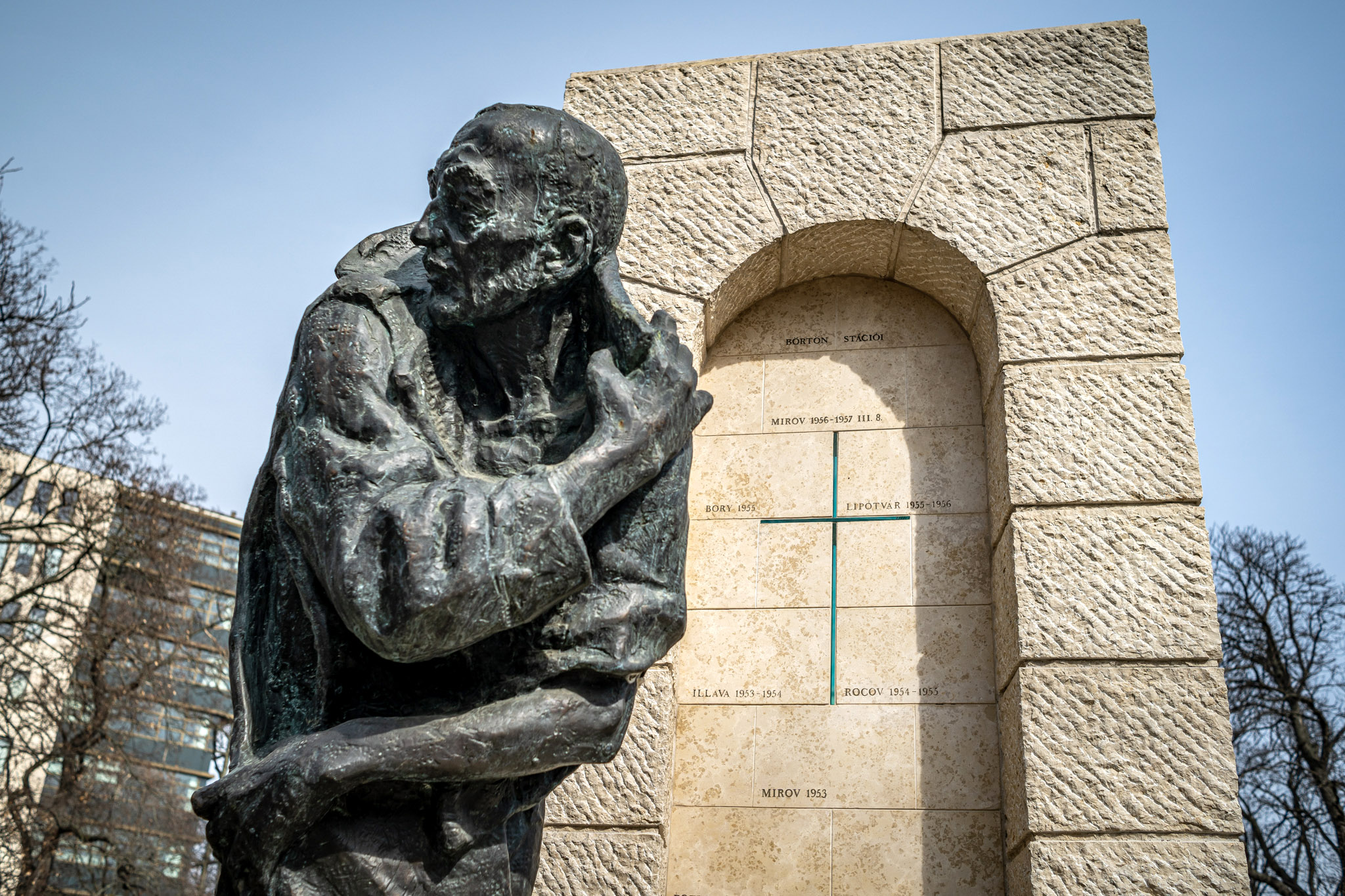 Behind the statue stands a carved block of stone, symbolising a walled prison window, but the arch encircles a thin transparent glass cross, next to which the sites of his suffering are listed.