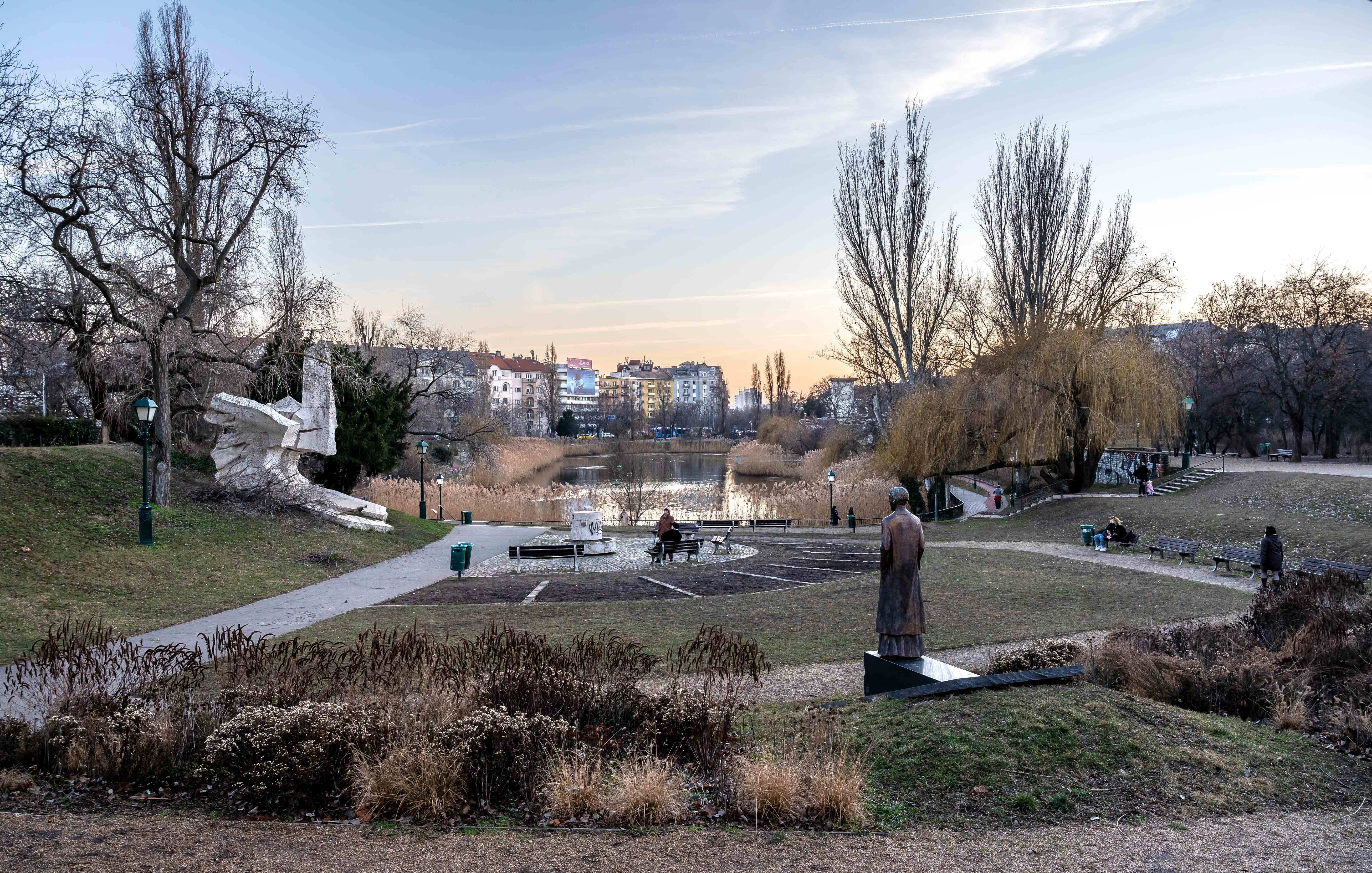 Among the buildings next to the lake, Szent Imre High School was completed in 1929, and St. Emeric Parish Church was consecrated in 1938.