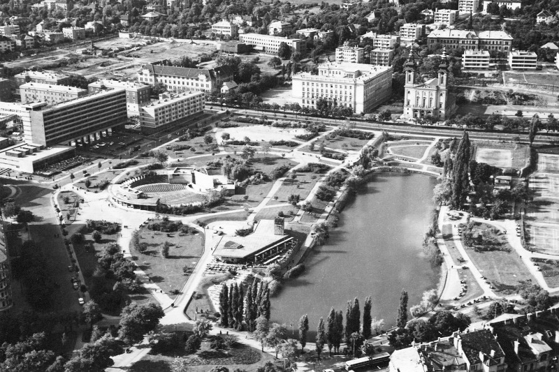 The Bottomless Lake in 1969, on its shores is the Park Restaurant, opposite is the Szent Imre High School and St. Emeric Parish Church (Photo: Fortepan/No.: 100898)