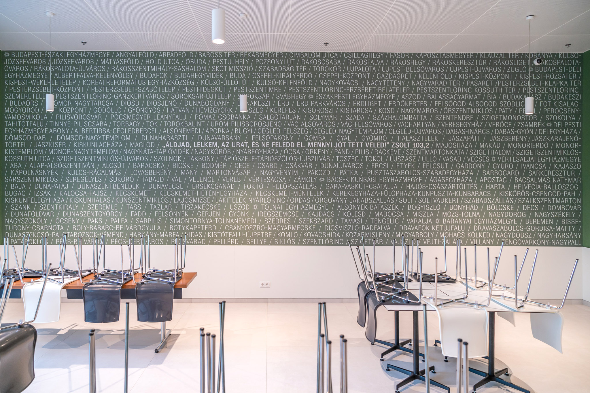 Although the double rooms with their modern equipment can provide really splendid conditions for young people, they also need social spaces. The hall also fulfils this need, but this is even more true for the restaurant to the left. Physically, only those who live and work in the building can be present here, but – as we learned from the Deputy Bishop – the congregations of the eight dioceses of the Dunamellék Reformed Church District are also symbolically on the wall: those that supported the construction of Ráday House with their donations. In the middle of the list that fills the entire wall, a biblical quote proclaims the common values and expresses the faithful's gratitude to God: "Praise the Lord, my soul, and forget not all his benefits!" (Psalms 103:2)