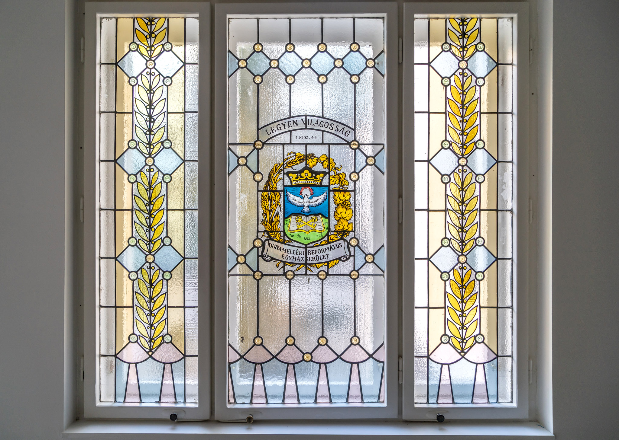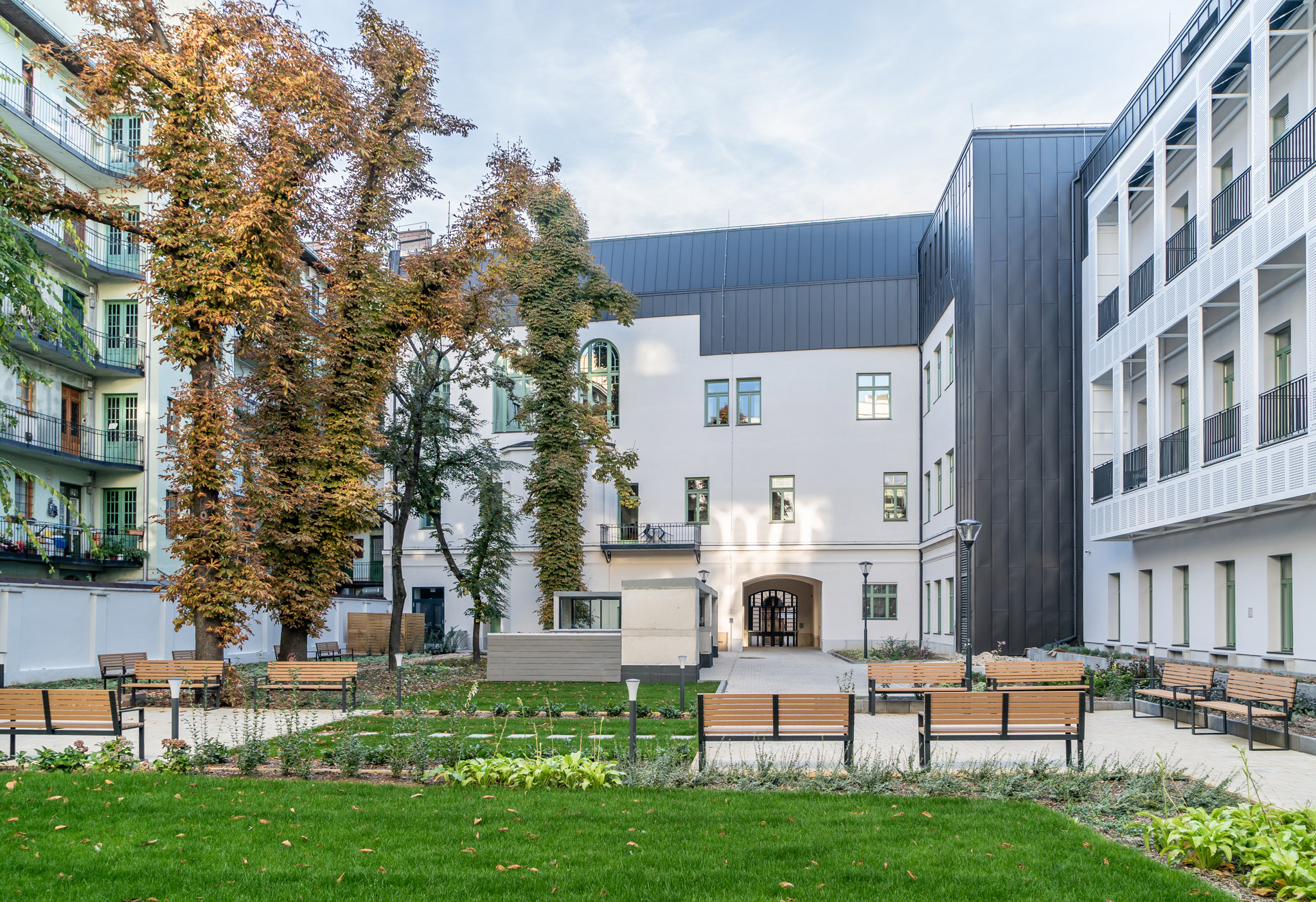 The well-known passage from the first book of Moses was already on one of the coloured glass windows of the old wing on Ráday Street at the beginning of the 20th century. During the current renovation and reconstruction, thanks to the large glass surfaces, the building is truly flooded with light. The facade of the old building on Ráday Street was not changed, but the previously closed doorway was opened, making it brighter and, of course, traffic became easier. The yard, which was previously used as a parking lot, has also become a community space, with a well-kept lawn and benches. Only the driveway of the underground garage reveals that there were once cars there. By the way, the entrance to the underground garage is from Biblia Street, although if necessary it is also possible through the Ráday Street gate.