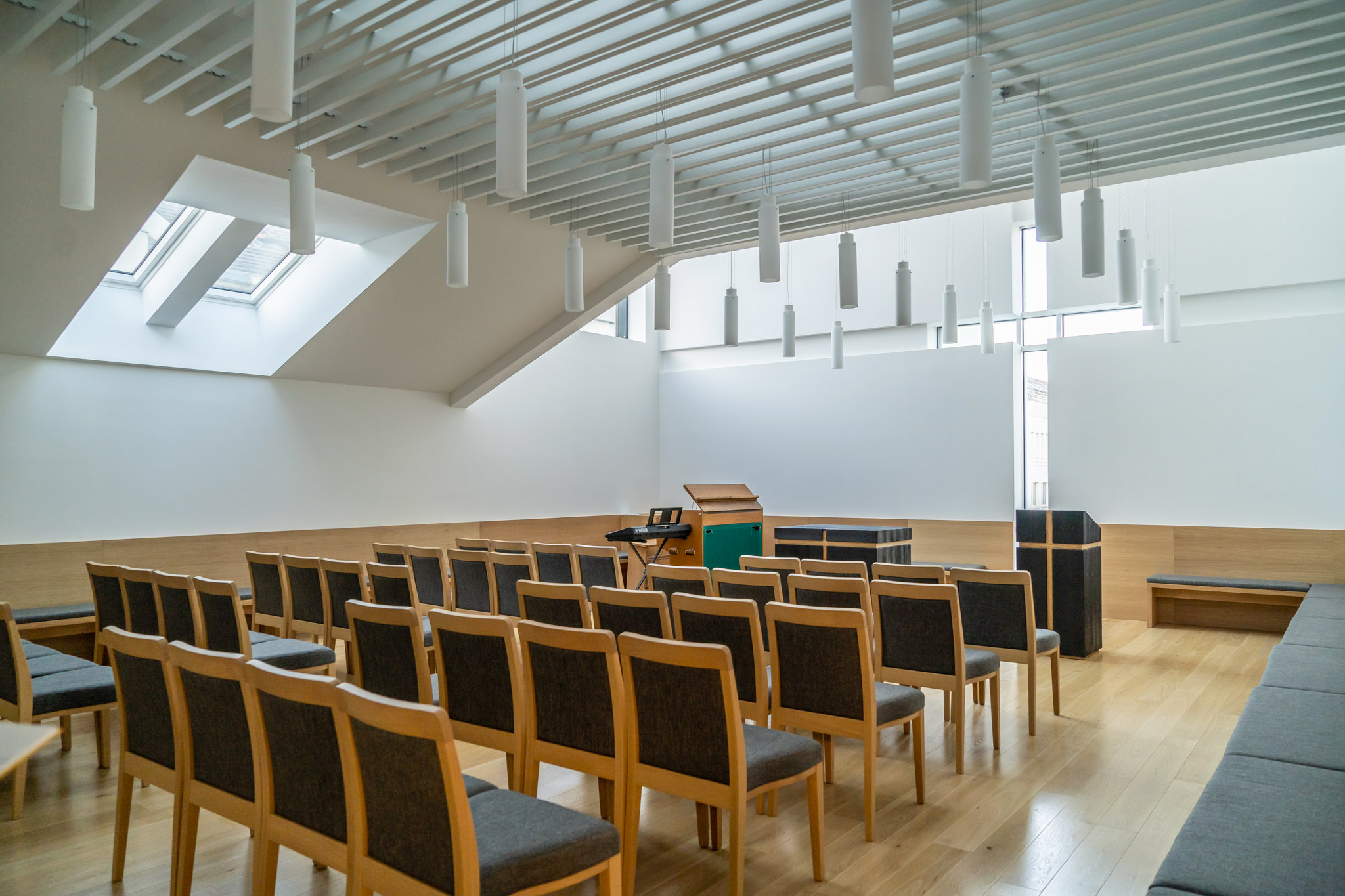 Many beautiful parts of the Holy Scriptures still appear on the walls, in the space opposite the main entrance - and reaching all the way to the roof - parts were taken from the Epistle to the Galatians. In accordance with the vertical accented space, the letters can be read arranged one below the other. This soaring part of the hall is lit by candles-like lamps hanging from the ceiling. Although they are really only needed in the dark, as the entire building is permeated with natural light, which was also the basic concept of the renovation: “Let there be light,” (Genesis 1:3).