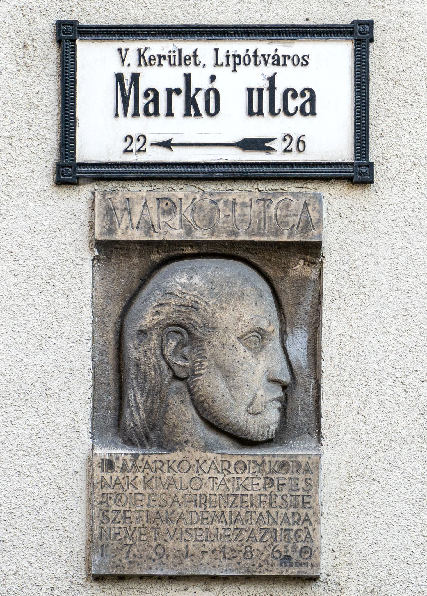 Bust of Béla Czóbel, 1983 by Imre Varga in the courtyard of the passage house on Sas Street (Photo: Balázs Both / pestbuda.hu)Markó utca is named after the romantic landscape painter Károly Markó Sr. (Lőcse [Levoča], 25 September 1791 - Villa di Lappeggi, Italy, 19 November 1860): the 1941 relief memorial plaque by Jenő Kerényi conserves his memory on the wall of the house at number 26.